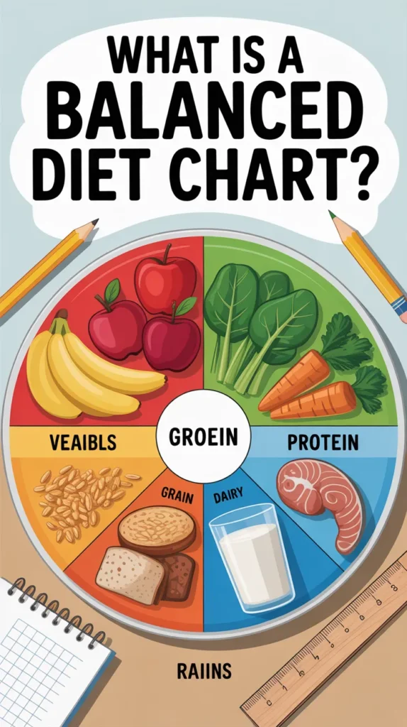 A balanced diet chart is a visual guide that shows all the different foods you should eat to keep your body healthy and strong. It tells you exactly what kinds of food to include in your meals and how much of each type you need every day to grow, have energy, and stay fit. Schools often ask students to make these charts for projects because they help you learn about nutrition in a practical way that you can actually use in your real life.