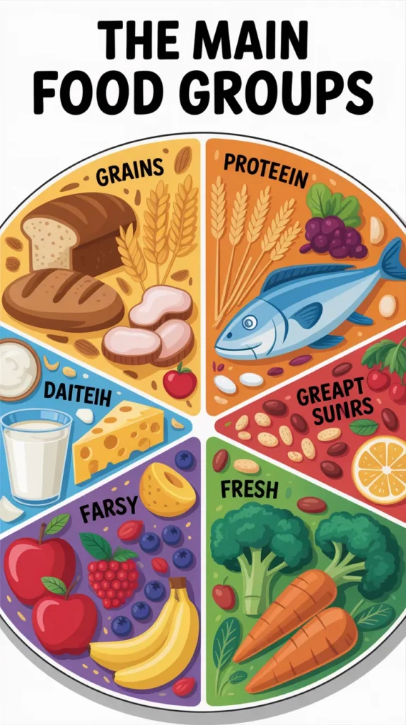 Eating healthy means choosing foods from five main groups that each give your body different things it needs to grow strong and stay healthy. These groups are grains, proteins, dairy, fruits, and vegetables. By eating a variety of foods from each group every day, you’ll get all the vitamins, minerals, and energy your body needs to learn, play, and feel your best. Here are the main groups of food.”