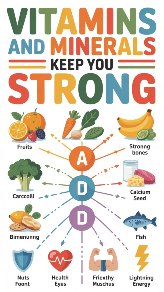 Vitamins and minerals are tiny nutrients your body needs to work properly and stay healthy. They help your bones grow strong, your immune system fight off sickness, and your eyes see clearly. Your body cannot make most vitamins and minerals on its own, so you have to get them through the food you eat. Eating a variety of colorful fruits and vegetables is the best way to get all the vitamins and minerals you need.