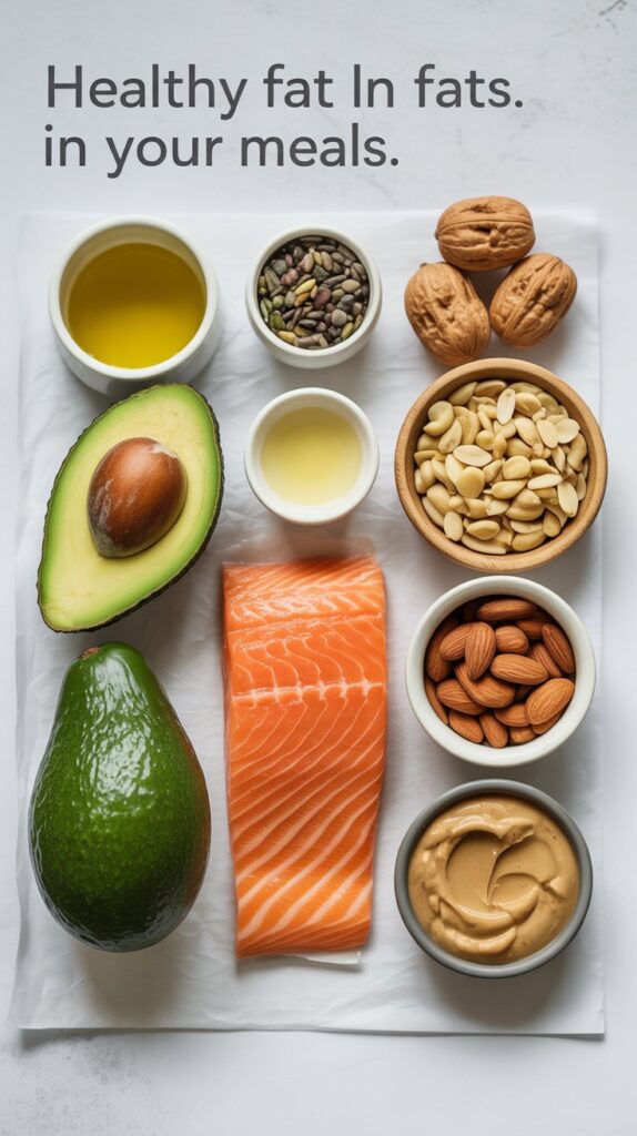 Add one source of healthy fat to each meal. Your body needs these fats to absorb vitamins and stay full between meals. You’ll notice less snacking and a flatter stomach when you include the right fats in your diet.
