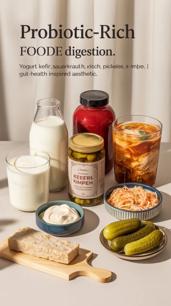 Probiotic foods contain live bacteria that improve your gut health and reduce bloating. A healthy gut means a flatter stomach because good bacteria help you digest food properly and prevent gas buildup.
