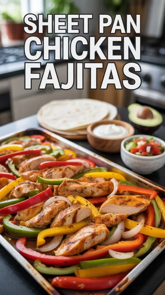 Sheet pan chicken fajitas are a fun and tasty dinner that cooks everything on one pan. The chicken and vegetables cook together in the oven, so you don’t stand at the stove. Everyone can build their own fajitas with their favorite toppings. This meal comes together in about 25 minutes.