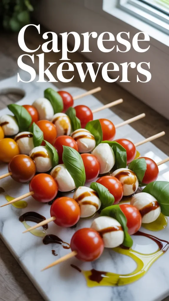 Serve the Caprese skewers immediately at room temperature for best flavor, or refrigerate for up to 2 hours if preparing in advance. Enjoy as a beautiful and delicious appetizer.