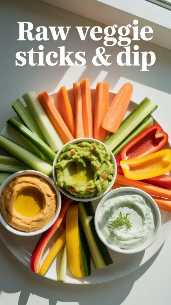 Raw veggie sticks with dip are the ultimate healthy snack that’s as simple as it is satisfying. This no-cook recipe is perfect for busy weekdays, party appetizers, or anytime you need a quick, nutritious bite. Crisp, colorful vegetables paired with creamy dips like hummus, guacamole, or tzatziki create a delicious combination that’s packed with vitamins, fiber, and flavor. Whether you’re looking for a light lunch, an after-school snack for kids, or a crowd-pleasing platter for gatherings, this versatile recipe comes together in minutes and can be customized with your favorite vegetables and dips. Plus, with proper storage, you can prep these veggie sticks in advance and have healthy snacks ready to grab throughout the week.