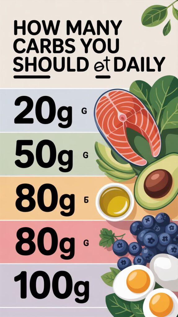 - Health conditions: Diabetes, insulin resistance, or polycystic ovary syndrome usually require keeping carbs under 50 grams to manage symptoms effectively.